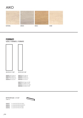 278NATURALGRIGIOMIELEAIKO20007876 x 60 AIKO BATTISCOPA GRIGIO20007856 x 60 AIKO BATTISCOPA NATURAL20007846 x 60 AIKO BATTISCOPA MIELE20007866 x 60 AIKO BATTISCOPA SANDBATTISCOPA 6x60 - 2.4%u201dx24%u201d (PZXBOX 14)FORMATISIZES / FORMATS / FORMATE2000781 AIKO Grigio rett.2000776 AIKO Miele rett.2000777 AIKO Natural rett.2000780 AIKO Sand rett.30x120 rett. 12%u201dx48%u201d2000772 AIKO Grigio rett.2000760 AIKO Miele rett.2000764 AIKO Natural rett.2000768 AIKO Sand rett.2000773 AIKO Grigio rett. GRIP2000761 AIKO Miele rett. GRIP2000765 AIKO Natural rett. GRIP2000769 AIKO Sand rett. GRIP20x120 rett. 8%u201dx48%u201dSAND
