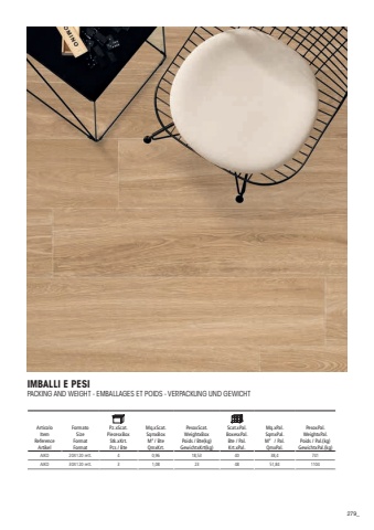 279IMBALLI E PESIPACKING AND WEIGHT - EMBALLAGES ET POIDS - VERPACKUNG UND GEWICHTArticoloItemReferenceArtikelFormatoSizeFormatFormat Pz.xScat.PiecesxBoxStk.xKrt.Pcs / BteMq.xScat.SqmxBoxM2 / BteQmxKrt.PesoxScat.WeightxBoxPoids / Bte(kg)GewichtxKrt(kg)Scat.xPal.BoxesxPal.Bte / Pal.Krt.xPal.Mq.xPal.SqmxPal.M2 / Pal.QmxPal.PesoxPal.WeightxPal.Poids / Pal.(kg)GewichtxPal.(kg)AIKO 20X120 rett.40,9618,534038,4741AIKO 30X120 rett.31,08234851,841104