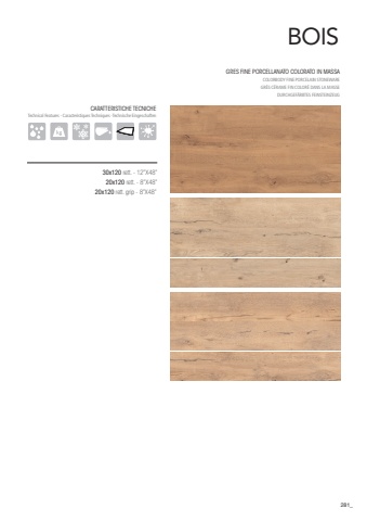 281BOIS20x120 rett. - 8%u201dX48%u201d30x120 rett. - 12%u201dX48%u201dCARATTERISTICHE TECNICHETechnical Features - Caracteristiques Techniques -Technische EingeschaftenGRES FINE PORCELLANATO COLORATO IN MASSA COLORBODY FINE PORCELAIN STONEWARE GR%u00c8S C%u00c9RAME FIN COLOR%u00c9 DANS LA MASSEDURCHGEF%u00c4RBTES FEINSTEINZEUG20x120 rett. grip - 8%u201dX48%u201d