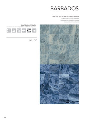 292BARBADOSGRES FINE PORCELLANATO COLORATO IN MASSA COLORBODY FINE PORCELAIN STONEWARE GR%u00c8S C%u00c9RAME FIN COLOR%u00c9 DANS LA MASSEDURCHGEF%u00c4RBTES FEINSTEINZEUG15x15 - 6%u201dx6%u201dCARATTERISTICHE TECNICHETechnical Features - Caracteristiques Techniques -Technische Eingeschaften