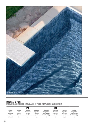294Cobalto 15x15 - 6%u201dx6%u201dIMBALLI E PESIPACKAGING AND WEIGHTS - EMBALLAGES ET POIDS - VERPACKUNG UND GEWICHTArticoloItemReferenceArtikelFormatoSizeFormatFormat Pz.xScat.PiecesxBoxStk.xKrt.Pcs / BteMq.xScat.SqmxBoxM2 / BteQmxKrt.PesoxScat.WeightxBoxPoids / Bte(kg)GewichtxKrt(kg)Scat.xPal.BoxesxPal.Bte / Pal.Krt.xPal.Mq.xPal.SqmxPal.M2 / Pal.QmxPal.PesoxPal.WeightxPal.Poids / Pal.(kg)GewichtxPal.(kg)BARBADOS 15x15441,00168080,001280