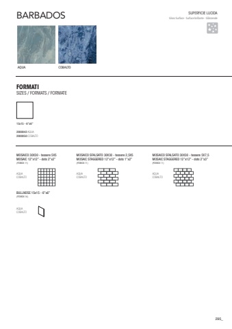 SUPERFICIE LUCIDA Gloss Surface - Surface brillante - Gl%u00e4nzende295AQUACOBALTOBARBADOSFORMATISIZES / FORMATS / FORMATE15x15 - 6%u201dx6%u201d2000042 AQUA2000050 COBALTOBULLNOSE 15x15 - 6%u201dx6%u201d(PZXBOX 14)AQUACOBALTO (PZXBOX 11)AQUACOBALTO MOSAICO 30X30 - tessere 5X5MOSAIC 12%u201dx12%u201d - dots 2%u201dx2%u201d(PZXBOX 11)AQUACOBALTO MOSAICO SFALSATO 30X30 - tessere 2,5X5MOSAIC STAGGERED 12%u201dx12%u201d - dots 1%u201dx2%u201dAQUACOBALTO MOSAICO SFALSATO 30X30 - tessere 5X7,5MOSAIC STAGGERED 12%u201dx12%u201d - dots 2%u201dx3%u201d(PZXBOX 11)
