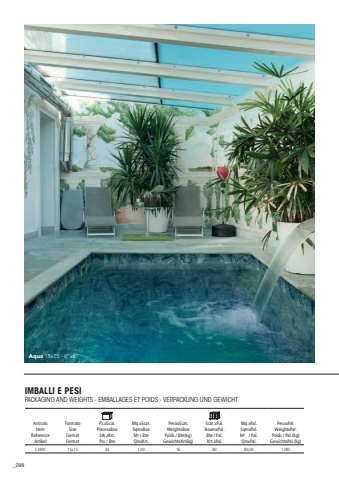 298Aqua 15x15 - 6%u201dx6%u201dArticoloItemReferenceArtikelFormatoSizeFormatFormat Pz.xScat.PiecesxBoxStk.xKrt.Pcs / BteMq.xScat.SqmxBoxM2 / BteQmxKrt.PesoxScat.WeightxBoxPoids / Bte(kg)GewichtxKrt(kg)Scat.xPal.BoxesxPal.Bte / Pal.Krt.xPal.Mq.xPal.SqmxPal.M2 / Pal.QmxPal.PesoxPal.WeightxPal.Poids / Pal.(kg)GewichtxPal.(kg)CAPRI 15x15441,00168080,001280IMBALLI E PESIPACKAGING AND WEIGHTS - EMBALLAGES ET POIDS - VERPACKUNG UND GEWICHT