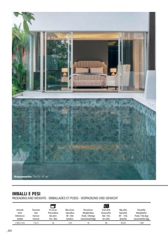 302Acquamarina 15x15 - 6%u201dx6%u201dArticoloItemReferenceArtikelFormatoSizeFormatFormat Pz.xScat.PiecesxBoxStk.xKrt.Pcs / BteMq.xScat.SqmxBoxM2 / BteQmxKrt.PesoxScat.WeightxBoxPoids / Bte(kg)GewichtxKrt(kg)Scat.xPal.BoxesxPal.Bte / Pal.Krt.xPal.Mq.xPal.SqmxPal.M2 / Pal.QmxPal.PesoxPal.WeightxPal.Poids / Pal.(kg)GewichtxPal.(kg)CORAL SEA 15x15441,00168080,001280IMBALLI E PESIPACKAGING AND WEIGHTS - EMBALLAGES ET POIDS - VERPACKUNG UND GEWICHT