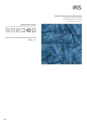 304IRISGRES FINE PORCELLANATO COLORATO IN MASSA COLORBODY FINE PORCELAIN STONEWARE GR%u00c8S C%u00c9RAME FIN COLOR%u00c9 DANS LA MASSEDURCHGEF%u00c4RBTES FEINSTEINZEUG15x15 - 6%u201dx6%u201dCARATTERISTICHE TECNICHETechnical Features - Caracteristiques Techniques -Technische Eingeschaften