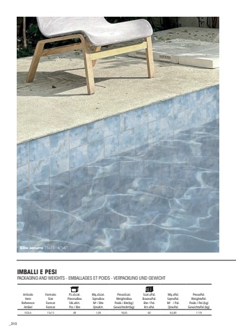 310Elba azzurro 15x15 - 6%u201dx6%u201dArticoloItemReferenceArtikelFormatoSizeFormatFormat Pz.xScat.PiecesxBoxStk.xKrt.Pcs / BteMq.xScat.SqmxBoxM2 / BteQmxKrt.PesoxScat.WeightxBoxPoids / Bte(kg)GewichtxKrt(kg)Scat.xPal.BoxesxPal.Bte / Pal.Krt.xPal.Mq.xPal.SqmxPal.M2 / Pal.QmxPal.PesoxPal.WeightxPal.Poids / Pal.(kg)GewichtxPal.(kg)ISOLA 15x15481,0818,656064,801119IMBALLI E PESIPACKAGING AND WEIGHTS - EMBALLAGES ET POIDS - VERPACKUNG UND GEWICHT