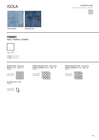 SUPERFICIE LUCIDA Gloss Surface - Surface brillante - Gl%u00e4nzende311ELBA AZZURROSARDEGNA BLUISOLAFORMATISIZES / FORMATS / FORMATE15x15 - 6%u201dx6%u201d2144933 ELBA AZZURRO2144932 SARDEGNA BLUELBA AZZURROSARDEGNA BLU (PZXBOX 11)ELBA AZZURROSARDEGNA BLU MOSAICO 30x30 - tessere 5x5MOSAIC 12%u201dx12%u201d - dots 2%u201dx2%u201d(PZXBOX 11)ELBA AZZURROSARDEGNA BLU MOSAICO SFALSATO 30x30 - tessere 2,5x5MOSAIC STAGGERED 12%u201dx12%u201d - dots 1%u201dx2%u201dELBA AZZURROSARDEGNA BLU MOSAICO SFALSATO 30x30 - tessere 5x7,5MOSAIC STAGGERED 12%u201dx12%u201d - dots 2%u201dx3%u201d(PZXBOX 11)BULLNOSE 15x15 - 6%u201dx6%u201d(PZXBOX 14)