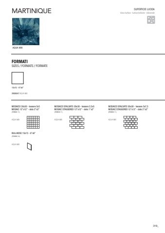 SUPERFICIE LUCIDA Gloss Surface - Surface brillante - Gl%u00e4nzende319AQUA MIXMARTINIQUEFORMATISIZES / FORMATS / FORMATE15x15 - 6%u201dx6%u201d2000047 AQUA MIXAQUA MIX(PZXBOX 11)AQUA MIXMOSAICO 30x30 - tessere 5x5MOSAIC 12%u201dx12%u201d - dots 2%u201dx2%u201d(PZXBOX 11)AQUA MIXMOSAICO SFALSATO 30x30 - tessere 2,5x5MOSAIC STAGGERED 12%u201dx12%u201d - dots 1%u201dx2%u201dAQUA MIXMOSAICO SFALSATO 30x30 - tessere 5x7,5MOSAIC STAGGERED 12%u201dx12%u201d - dots 2%u201dx3%u201d(PZXBOX 11)BULLNOSE 15x15 - 6%u201dx6%u201d(PZXBOX 14)