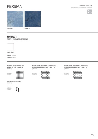 SUPERFICIE LUCIDA Gloss Surface - Surface brillante - Gl%u00e4nzende323AZZURROCOBALTOPERSIANFORMATISIZES / FORMATS / FORMATE15x15 - 6%u201dx6%u201d2148421 AZZURRO2148420 COBALTOAZZURROCOBALTO (PZXBOX 11)AZZURROCOBALTOMOSAICO 30x30 - tessere 5x5MOSAIC 12%u201dx12%u201d - dots 2%u201dx2%u201d(PZXBOX 11)AZZURROCOBALTO MOSAICO SFALSATO 30x30 - tessere 2,5x5MOSAIC STAGGERED 12%u201dx12%u201d - dots 1%u201dx2%u201dAZZURROCOBALTOMOSAICO SFALSATO 30x30 - tessere 5x7,5MOSAIC STAGGERED 12%u201dx12%u201d - dots 2%u201dx3%u201d(PZXBOX 11)BULLNOSE 15x15 - 6%u201dx6%u201d(PZXBOX 14)