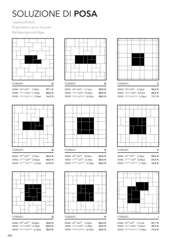 332SOLUZIONE DI POSALaying solutionPropositions pour la poseVerlegungvorschl%u00e4geFORMATIA60X60 235/8%u201dx235/8%u201d (1,59pz) 30X60 1113/16%u201dx235/8%u201d (1,59pz) 30X30 1113/16%u201dx1113/16%u201d (1,59pz) 57,1 % 28,6 %14,3 %FORMATIB60X60 235/8%u201dx235/8%u201d (1,11pz) 30X60 1113/16%u201dx235/8%u201d (2,22pz) 30X30 1113/16%u201dx1113/16%u201d (2,22pz) 40,0 % 40,0 %20,0 %FORMATIC60X60 235/8%u201dx235/8%u201d (1,23pz) 30X60 1113/16%u201dx235/8%u201d (2,47pz) 30X30 1113/16%u201dx1113/16%u201d (1,23pz) 44,4 % 44,4 %11,1 %FORMATID60X60 235/8%u201dx235/8%u201d (1,01pz) 30X60 1113/16%u201dx235/8%u201d (3,03pz) 30X30 1113/16%u201dx1113/16%u201d (1,01pz) 36,4 % 54,5 %9,10 %FORMATIE60X60 235/8%u201dx235/8%u201d (0,69pz) 30X60 1113/16%u201dx235/8%u201d (2,78pz) 30X30 1113/16%u201dx1113/16%u201d (2,78pz) 25,0 % 50,0 %25,0 %FORMATIF60X60 235/8%u201dx235/8%u201d (1,39pz) 30X60 1113/16%u201dx235/8%u201d (2,08pz) 30X30 1113/16%u201dx1113/16%u201d (1,39pz) 50,0 % 37,5 %12,5 %FORMATIG60X60 235/8%u201dx235/8%u201d (0,69pz) 30X60 1113/16%u201dx235/8%u201d (2,78pz) 30X30 1113/16%u201dx1113/16%u201d (2,78pz) 25,0 % 50,0 %25,0 %FORMATIH60X60 235/8%u201dx235/8%u201d (1,39pz) 30X60 1113/16%u201dx235/8%u201d (1,39pz) 30X30 1113/16%u201dx1113/16%u201d (2,78pz) 50,0 % 25,0 %25,0 %FORMATII60X60 235/8%u201dx235/8%u201d (1,31pz) 30X60 1113/16%u201dx235/8%u201d (1,96pz) 30X30 1113/16%u201dx1113/16%u201d (1,96pz) 47,1 % 35,3 %17,6 %