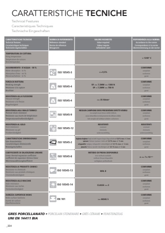 334CARATTERISTICHE TECNICHETechnical FeaturesCaracteristiques TechniquesTechnische EingeschaftenCARATTERISTICHE TECNICHETechnical features Caracteristiques techniquesTechnische eigenschaftenNORMA DI RIFERIMENTOReference standard Norme de referenceBesugnormVALORE RICHIESTOValue requiredValeur requiseGeforderter wertRISPONDENZA ALLA NORMAAccordance to the normeCorrespondance %u00e0 la normeUbereinstimmung an die normeTEMPERATURA DI COTTURAFiring temperatureTemp%u00e9rature de cuissonBrenntemperatur > 1200%u00b0 CASSORBIMENTO D%u2019ACQUA - IN %Water absorption - in % Absorption d%u2019eau - en %Wasseraufnahme - in %<= 0,5%CONFORMEcompliantconformesgem%u00e4FORZA DI ROTTURABreaking strengthR%u00e9sistance %u00e0 la rupture BruchlastSP. >= 7,5MM >= 1300 NSP. < 7,5MM >= 700 NCONFORMEcompliantconformesgem%u00e4RESISTENZA ALLA FLESSIONEFlexural strengthResistance a la flexionBiegefestigkeit>= 35 N/mm2CONFORMEcompliantconformesgem%u00e4RESISTENZA AGLI SBALZI TERMICIThermal shock resistanceResistance aux %u00e9carts de temp%u00e9ratureTemperaturwechselbest%u00e4ndlgkeitNESSUN CAMPIONE DEVE PRESENTARE DIFETTI VISIBILIno sample must show visible defectsaucun %u00e9chantillon ne doit presenter des d%u00e9fauts visibleskein exmplar soll sichtbare sch%u00e4den aufweisenCONFORMEcompliantconformesgem%u00e4RESISTENZA AL GELOFrost resistanceR%u00e9sistance au gelFrostbest%u00e4ndigkeitRESISTENTIresistantr%u00e9sistantswiderstandsf%u00e4higRESISTENTIresistantr%u00e9sistantswiderstandsf%u00e4higCARATTERISTICHE DIMENSIONALISize characteristicsCaracteristiques diminsionelleMasseigenschaftenlunghezza e larghezza/ lenght and width / longueur et largeur / l%u00e4nge und breite +/- 0,6 % max +/- 2 mmspessore / thckness / epaisseur / st%u00e4rke +/- 5,0 % max +/- 5 mmortogonalit%u00e0 / wedging / orthogonalit%u00e8 / rechtwinkligkeit +/- 0,5 % max +/- 2 mmplanarit%u00e0/ flatness / plan%u00e9it%u00e9 / ebenfl%u00e4chigkeit +/- 0,5 % max +/- 2 mmCONFORMEcompliantconformesgem%u00e4COEFFICIENTE DI DILATAZIONE LINEARELinear thermal expansion coefficientcoefficient de expansion t%u00e9rmica linearW%u00e4ermeausdehnungskoeffizientMETODO DI PROVA DISPONIBILEtest method availablem%u00e9thod d%u2019essai disponibleverf%u00fcgbare pr%u00fcfmethodea <= 7 x 10-6/%u00b0CRESISTENZA AI PRODOTTI CHIMICIResistance to chemicalsResistance aux produits chimiquesChemikallendestigkeitMIN. BCONFORMEcompliantconformesgem%u00e4RESISTENZA ALLE MACCHIEStain resistanceR%u00e9sistance aux taches Fleckenbest%u00e4ndigkeitCLASSE >= 3CONFORMEcompliantconformesgem%u00e4DUREZZA SUPERFICIE MOHSMohs surface hardnessDuret%u00e9 de surfaceOberfl%u00e4chenh%u00e4rte>= MOHS 5CONFORMEcompliantconformesgem%u00e4ISO 10545-3ISO 10545-4ISO 10545-4ISO 10545-12ISO 10545-2ISO 10545-8ISO 10545-13ISO 10545-14EN 101ISO 10545-9GRES PORCELLANATO %u2022 PORCELAIN STONEWARE %u2022 GR%u00c8S C%u00c9RAME %u2022 FEINSTEINZEUGUNI EN 14411 BIA